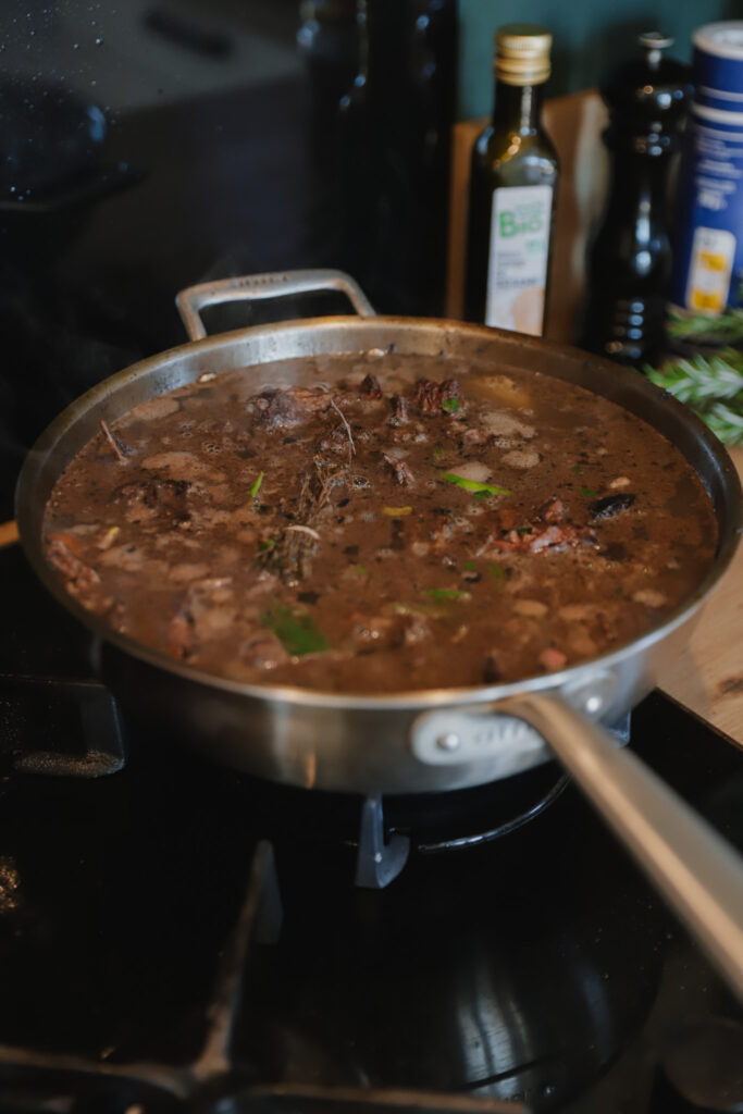 Dès que les sucs sont bien décollés ajouter le vin (la marinade) et mélanger pour décoller les derniers sucs restants.