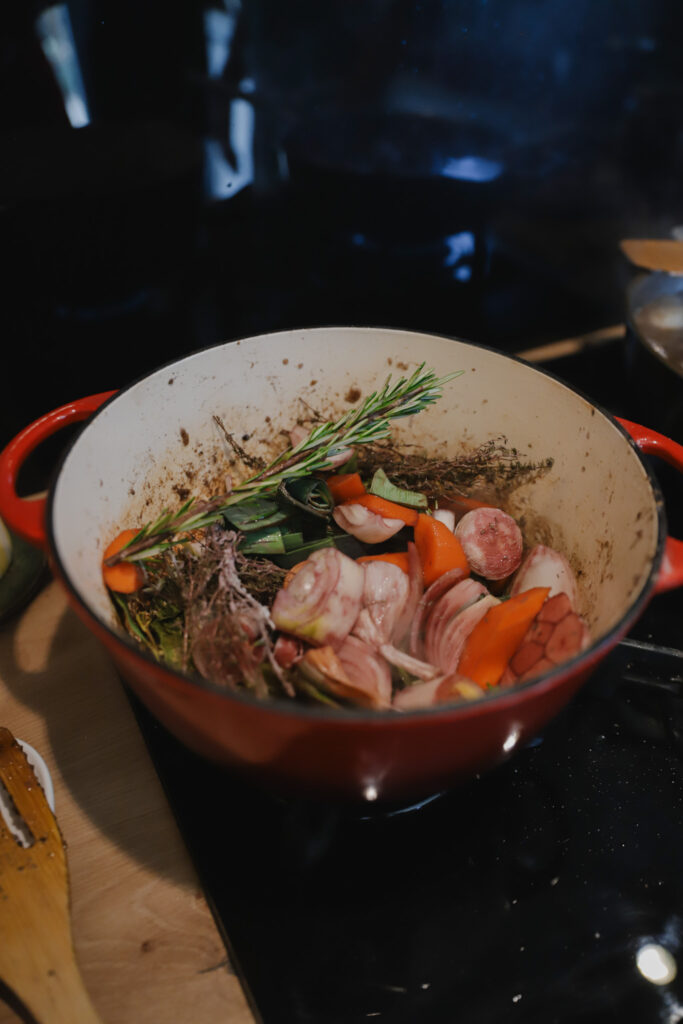 2. Préparer le bouillon : faire dorer les carcasses dans une cocotte. Dès qu’elles sont bien dorées, les retirer. Ajouter dans la cocotte 1 oignon, la moitié du poireau, 1 carotte, quelques gousses d’ail et du thym puis assaisonner. Mélanger et faire revenir pour bien décoller les sucs. Remettre les carcasses et mouiller à niveau. Cuire longtemps à feu moyen pour avoir un bouillon de qualité. Après 1h30, passer le bouillon au chinois et réserver.