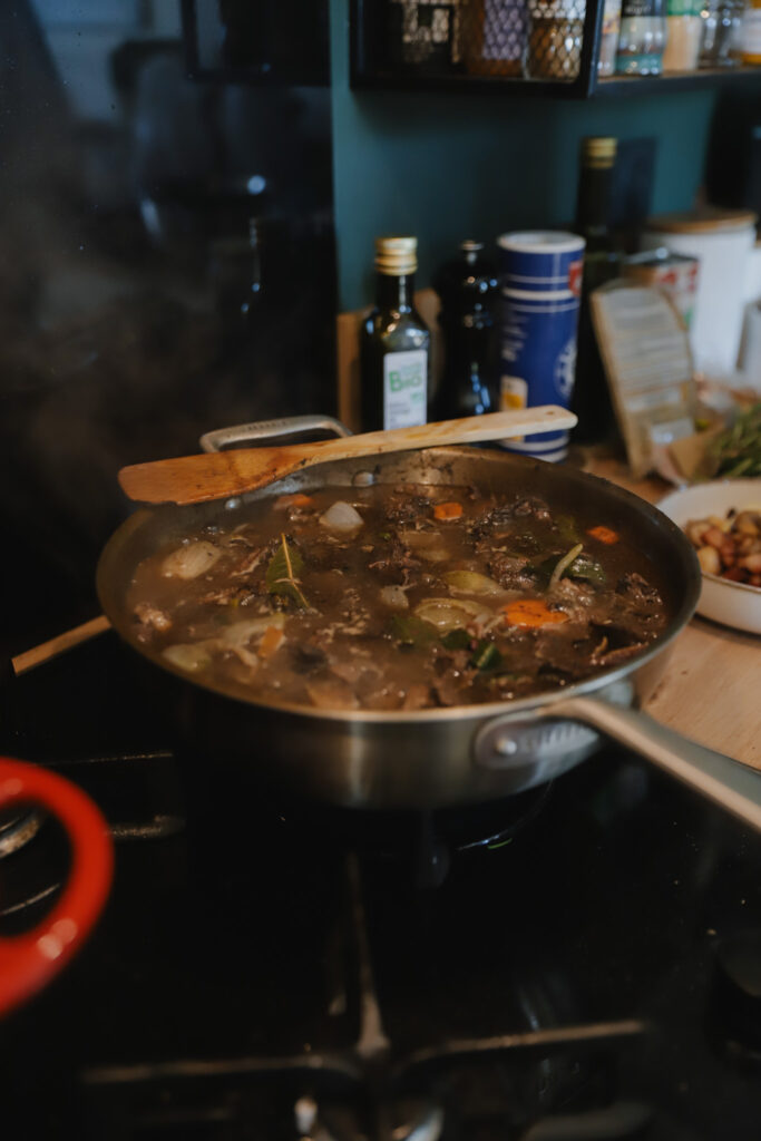 5. Dans la cocotte, mettre la viande, verser le bouillon à hauteur, fermer et enfourner 40 minutes à 160 degrés.