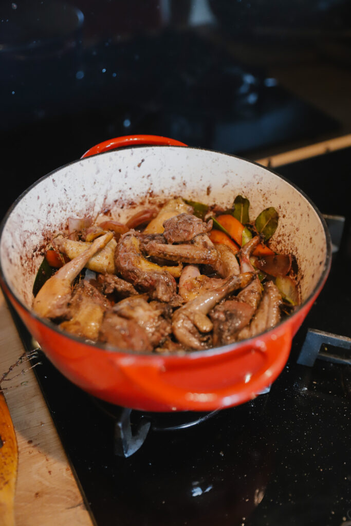 1. (La veille) faire mariner les 2 carottes, la moitié du poireau, 2 oignions coupés en gros morceaux et l’ail coupé en deux. Ajouter les morceaux de pigeons, le poivre, le bouquet garnis. Arroser le tout de vin rouge. Filmer et laisser au frigo 12h environ.