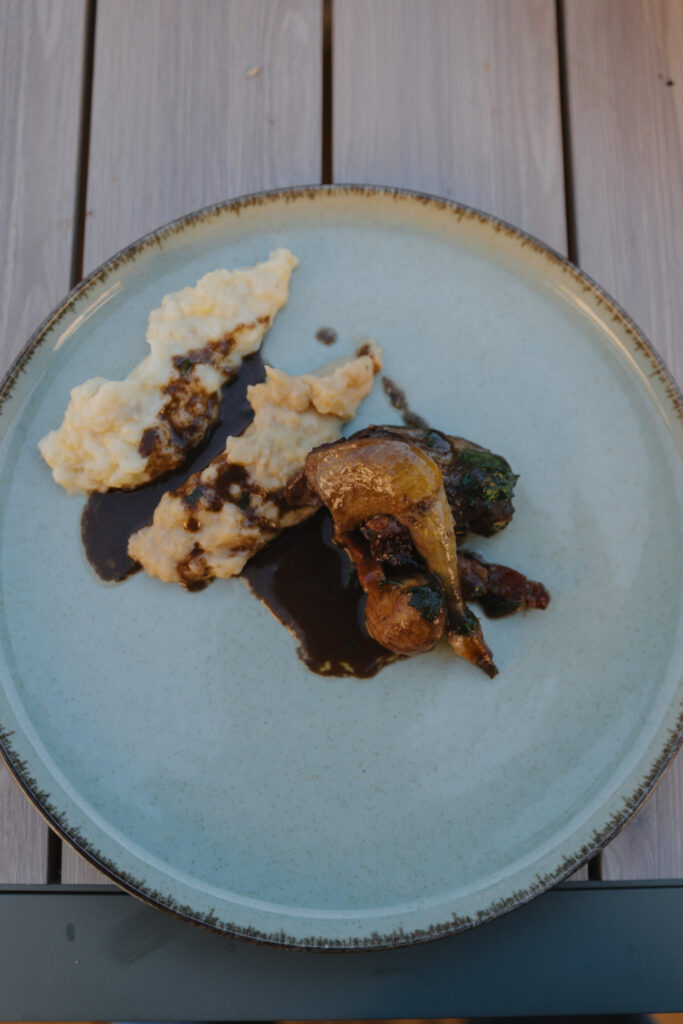 6. Sortir du four, passer le jus au chinois et le faire réduire de ¾. Il doit avoir une texture sirupeuse. Mettre les lardons, les champignons, un peu de persil ainsi que les morceaux de pigeons dans le jus. Mélanger délicatement. Dresser dans une assiette avec une bonne purée.